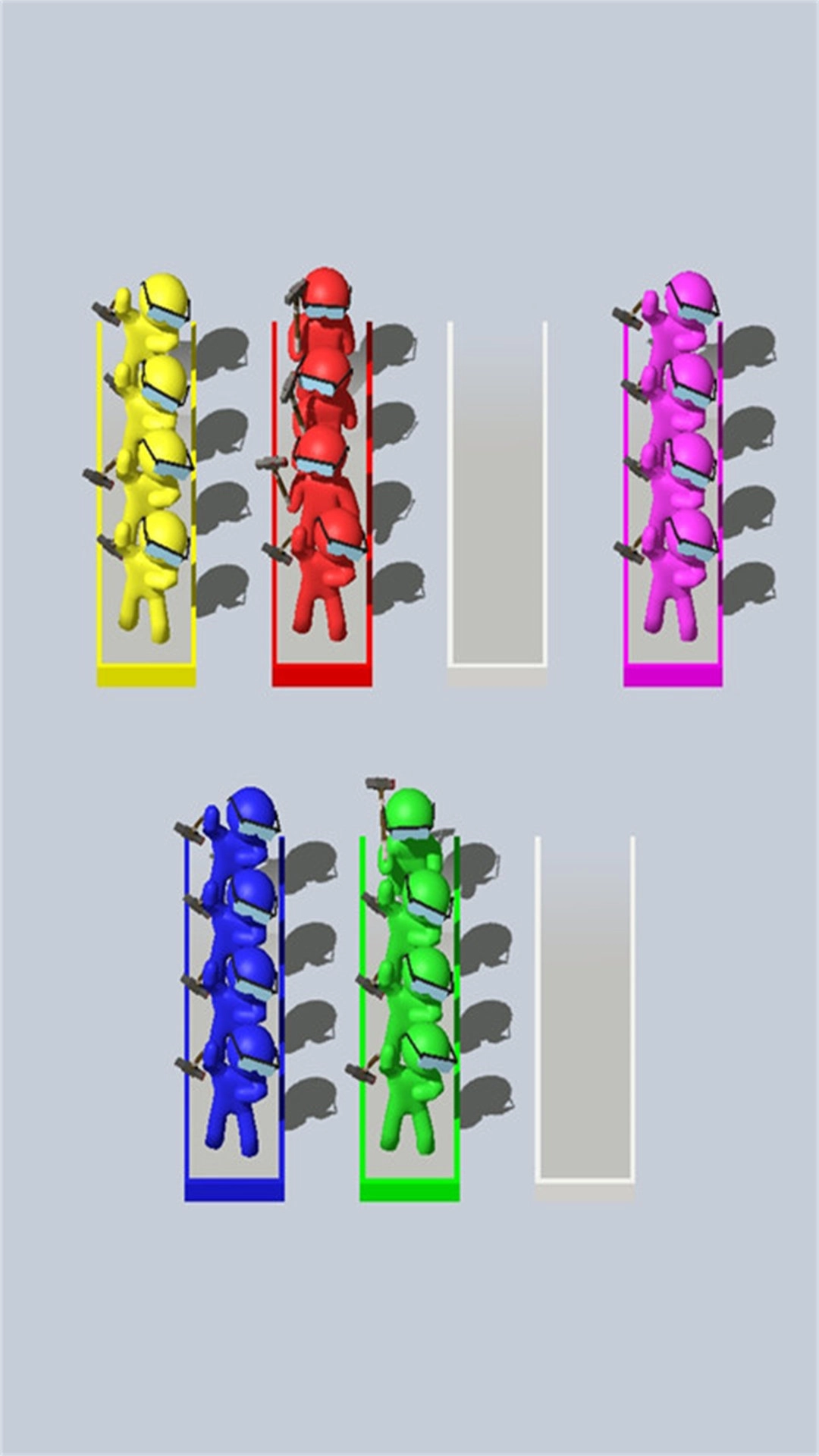 把杯子里小人们的颜色区分归类,直到每类颜色都完全一致,再把水倒进每一根管子里。