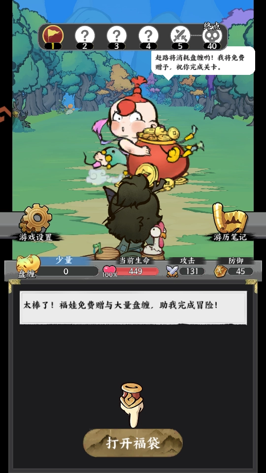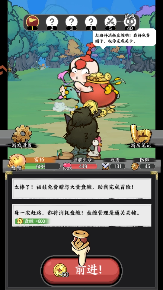 2、点击前进按钮会消耗盘缠以进入下一个节点,若盘缠数量不足,系统将自动消耗生命值;在节点切换过程中,玩家会遭遇各类随机事件或触发战斗环节;游戏的通关要求为:成功抵达终点节点,并战胜最终boss。