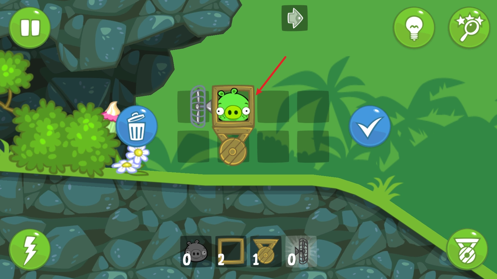 观察结束后,我们就能正式着手设计小猪的载具了。具体操作是把下方的各类物品放进空格中,通过这种方式制作出不同的载具,帮助小猪顺利前进。