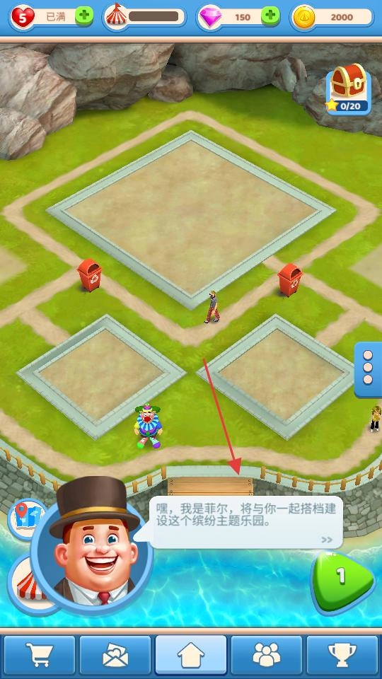 打开佳作后,看到角色菲尔的对话气泡,得知要一起搭建主题乐园,接着按照指引留意场景提示,由此开启乐园建设的初始流程。