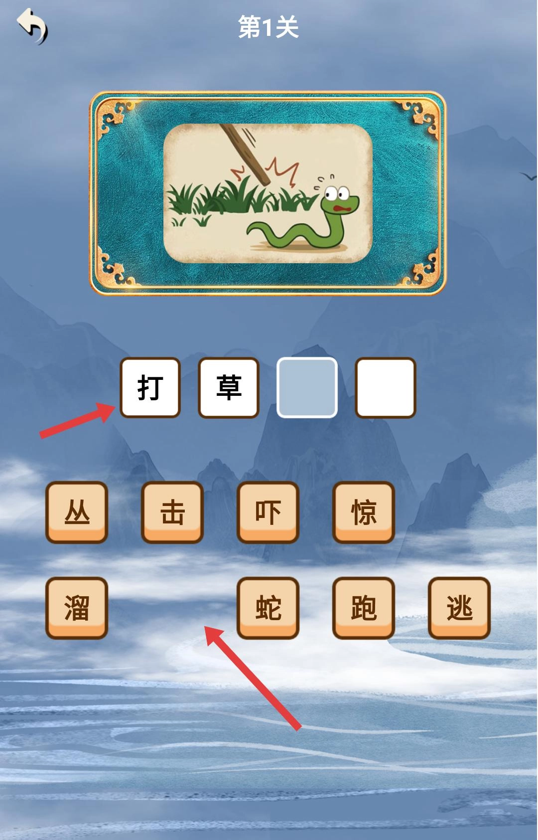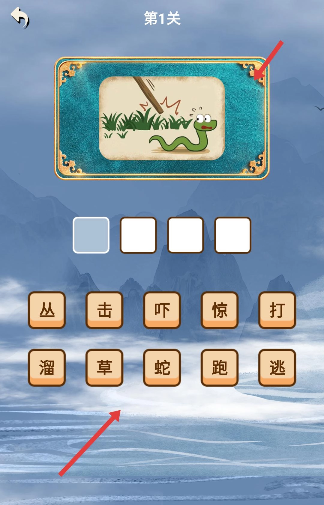在关卡里认真观察所给图片的内容,把图片里呈现的元素和场景结合起来,思索对应的成语。