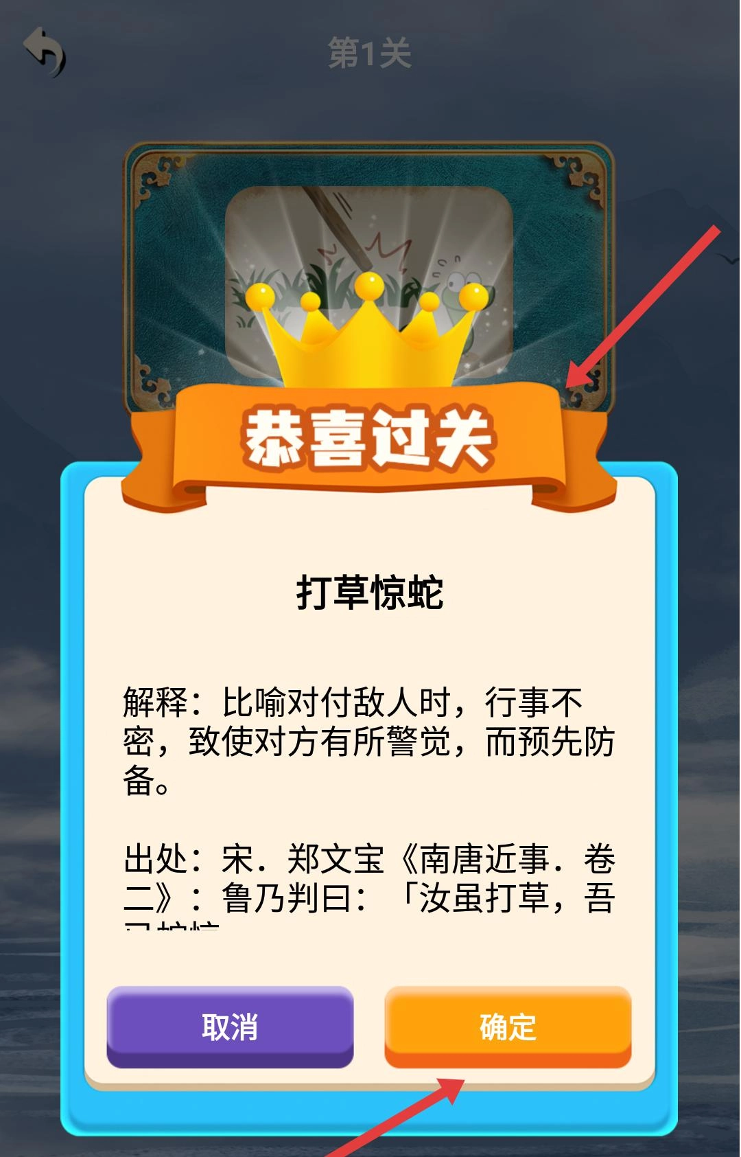当填入的字能组成正确的成语时,系统会显示“恭喜过关”的提示,同时呈现该成语的解释与出处。点击“确定”按钮,即可进入下一关继续挑战。