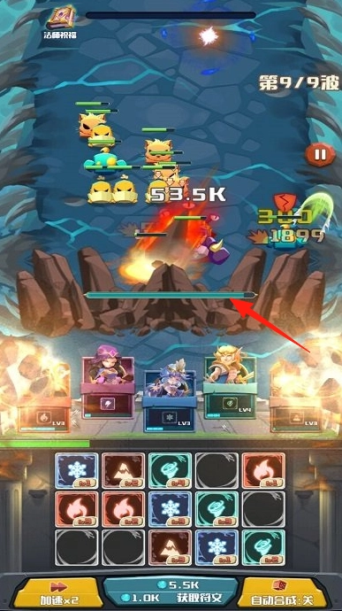 英雄布阵时选用“法藤织焰”等英雄,组建防御阵容,以应对9波怪物的进攻,重点防御第2、7、9波。