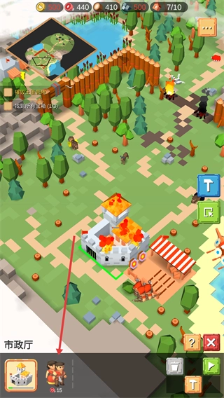 1、红箭头所指的是【市政厅】,建议优先解锁此建筑,这样能提升营地的管理效率。