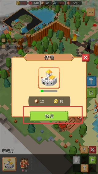 2、点击红框内【修理】按钮,修复受损的城堡建筑。