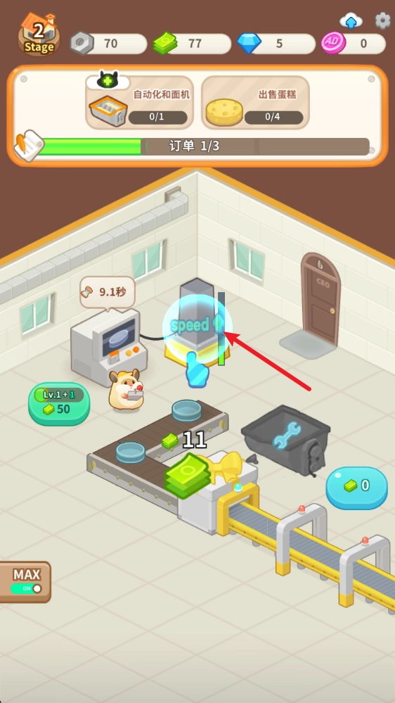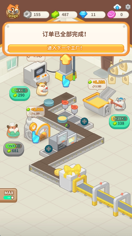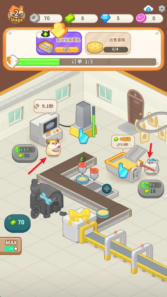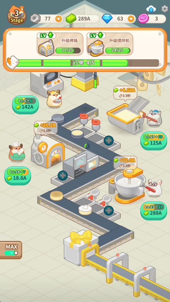 打造并升级各类机器,为其配备合适的仓鼠经理来负责管理,以此达成蛋糕制作的全自动化流程,进而完成更多的订单任务。
