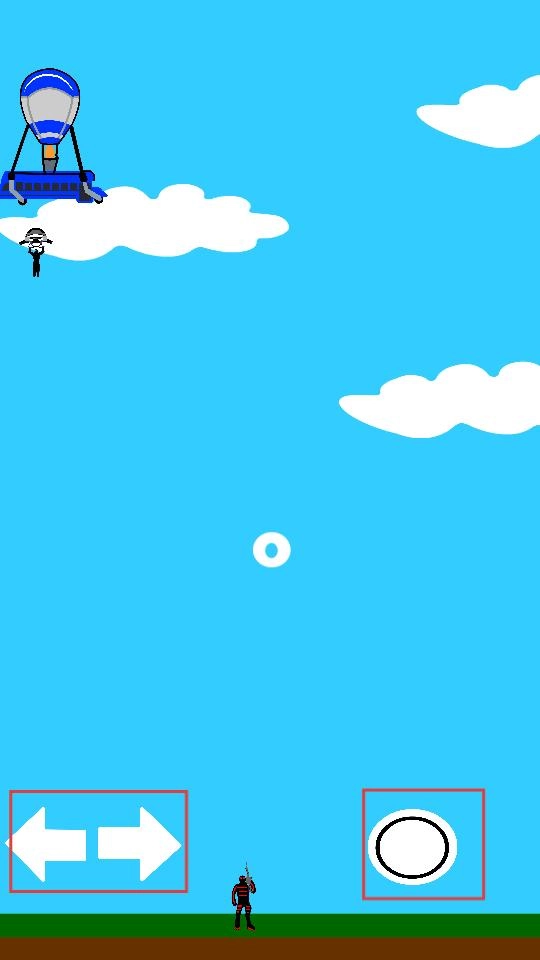 通过左右箭头操控角色横向移动,点击圆形按钮进行射击,消灭从热气球上跳下的敌人,避免敌人到达地面。