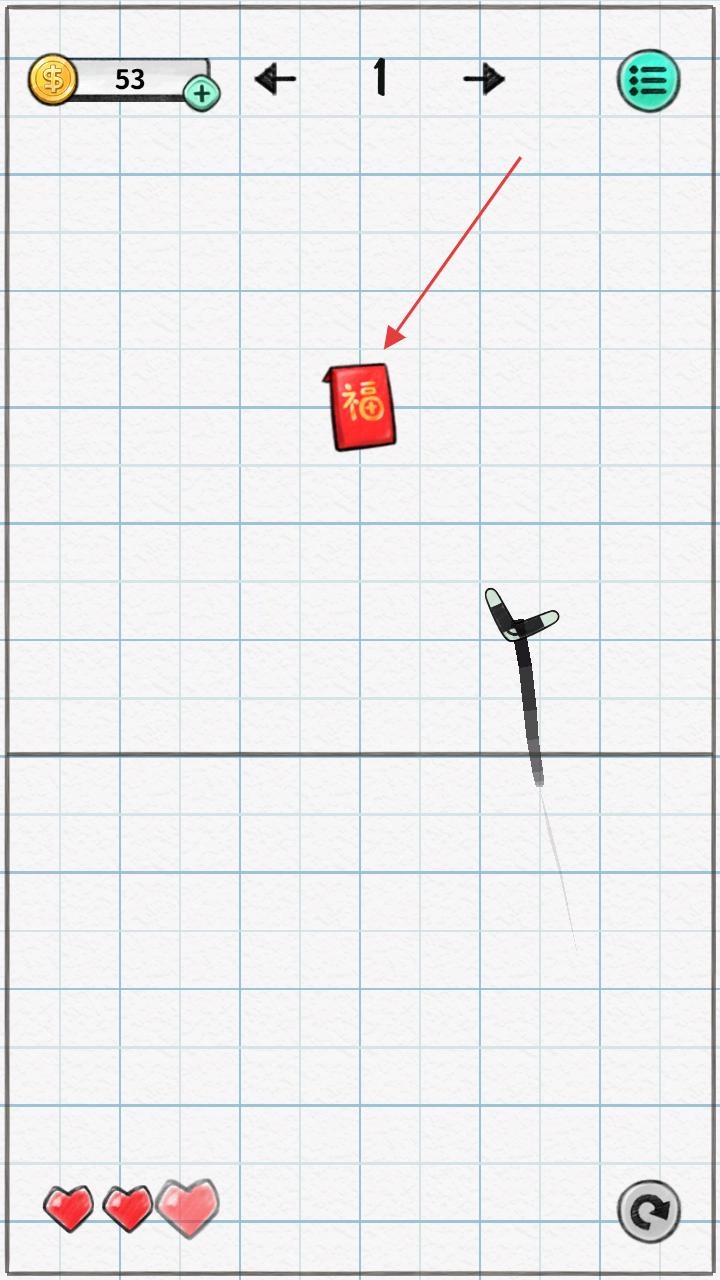 操作后金币数量更新为53,借助弹弓类道具,对准福字红包进行发射,精准击中可赢得更多金币,助力关卡推进。