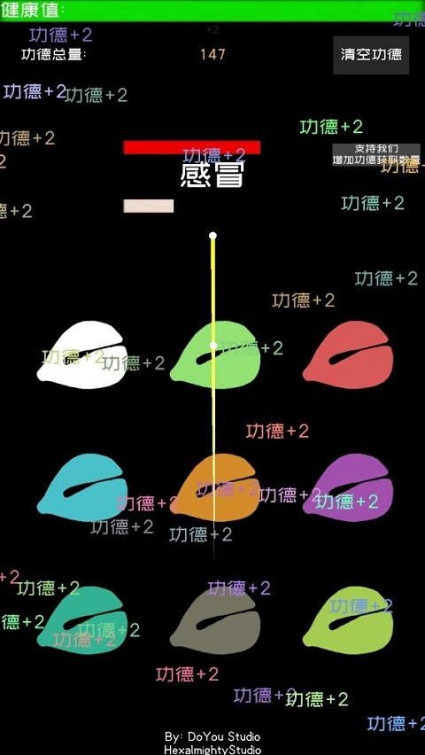 顶部的绿色代表健康值,它会随时间不断减少,一旦数值降到0,任务就会失败。而持续敲击木鱼能让健康值保持稳定;游戏里的红色则代表可能出现的身体“灾害”,连续敲木鱼可以化解擦伤、感冒、刀伤这类意外状况。