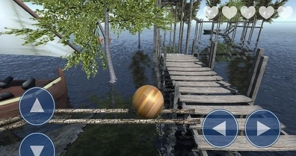 周围尽是水域,木桥上的平衡球得躲开障碍物,别掉进水里,顺利抵达终点。