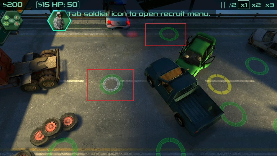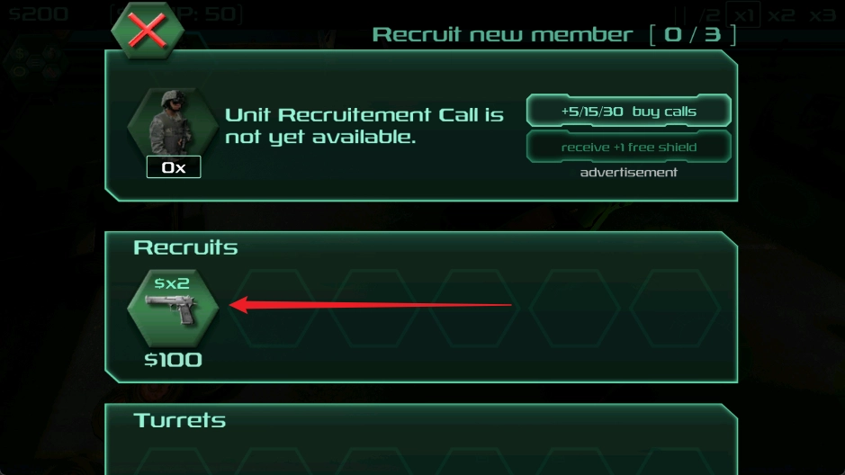 点击界面圆圈区域来购买士兵和装备。