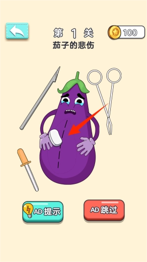 当发现表情痛苦的茄子时,可借助橡皮擦工具,仔细查看其腹部区域来探寻相关线索。