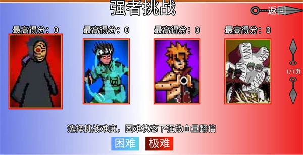 2、这里可以选择忍者挑战,里面有多个boss。选择一个,再选择难度。