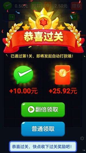 3、当积分达到过关要求后,就能顺利通关并领取红包奖励了。
