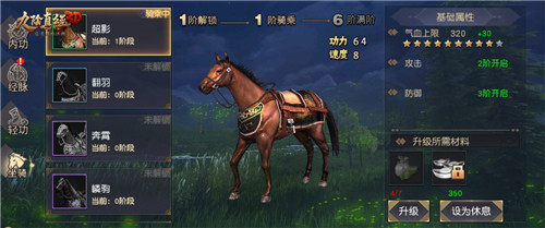坐骑通过使用草料和银子来对坐骑进行饲养升级,达到提升属性和功力的目的。草料的主要来源为:环式任务、帮贡兑换、元帝宝藏及商会购买。