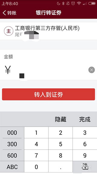 默认的银行是开户时绑定的银行卡。输入金额后点击转入到证券;