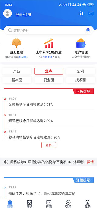 2、进入主界面会看到首页、自选股、行情、交易、我的五个板块,其中首页中有着产业、焦点、宏观、基本面、基金面、技术面等众多方面的资讯可供免费查看: