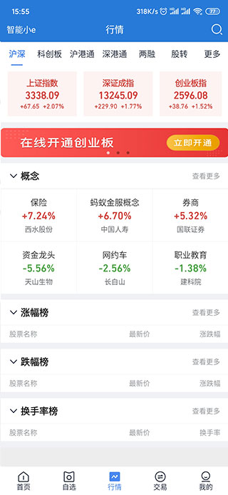 4、在行情中可以看到每一只股票的涨、跌、停、换手率,且还为他们榜单,以便更好的观察: