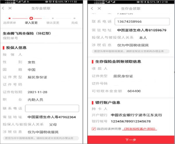 3、核实客户身份信息后,填写其他身份信息,确定银行账号信息,确认无误后点击“下一步”到确认变更页面。
