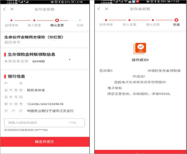 4、在此页面再次确定领取金额及银行账号信息,确认无误后,系统发送验证码,验证通过后,生存保险金领取操作完成。