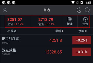 3、在“自选”中,可以查看上证、创业、新闻以及资金;