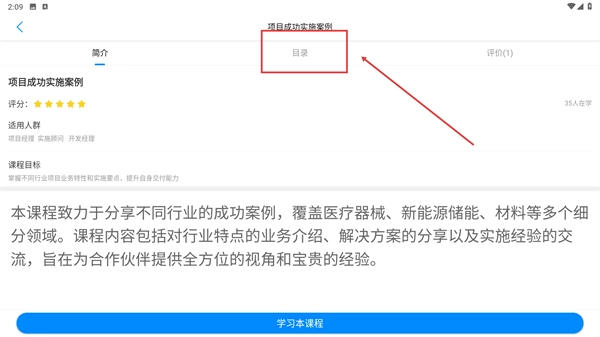 2、在课程详情页面,点击【目录】标签,即可查看该课程的课时列表,从而了解学习内容的结构和分布情况。