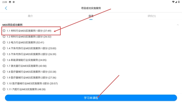 3、在目录页找到具体课时(例如“1.1材料行业MES实施案例-1部分”),点击【学习本课程】按钮,即可开始学习对应内容。