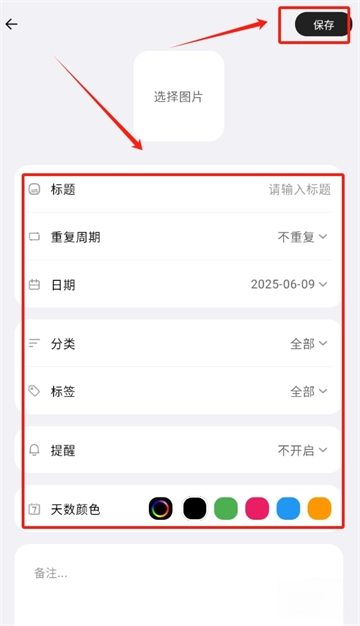 3、完善事件详情:填写标题、设置重复周期、选择日期、添加分类标签、配置提醒通知,最后点击保存完成记录。