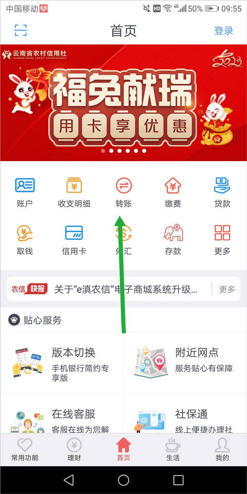 1、登录云南农信手机银行app,进入首页后点击【转账】