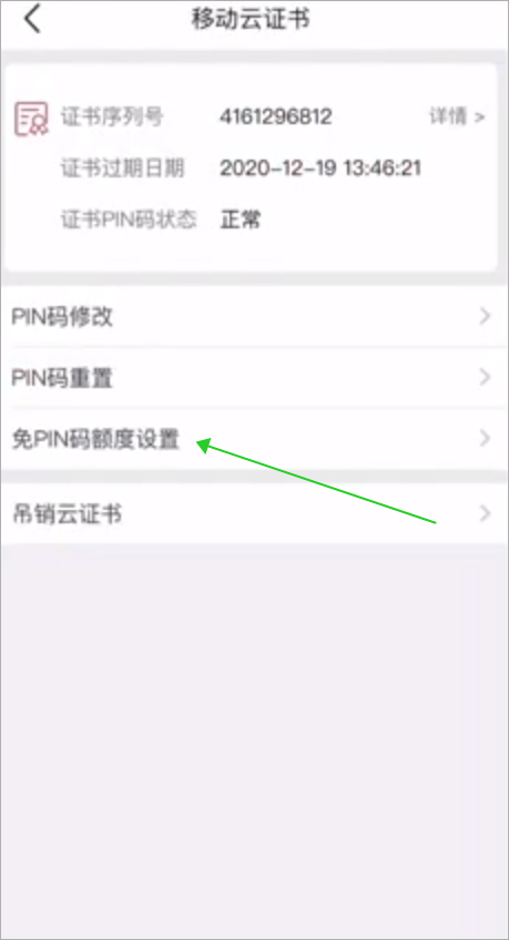 7、获得云证书后,点击【免pin码额度设置】进行设置,方便日后进行额度设置