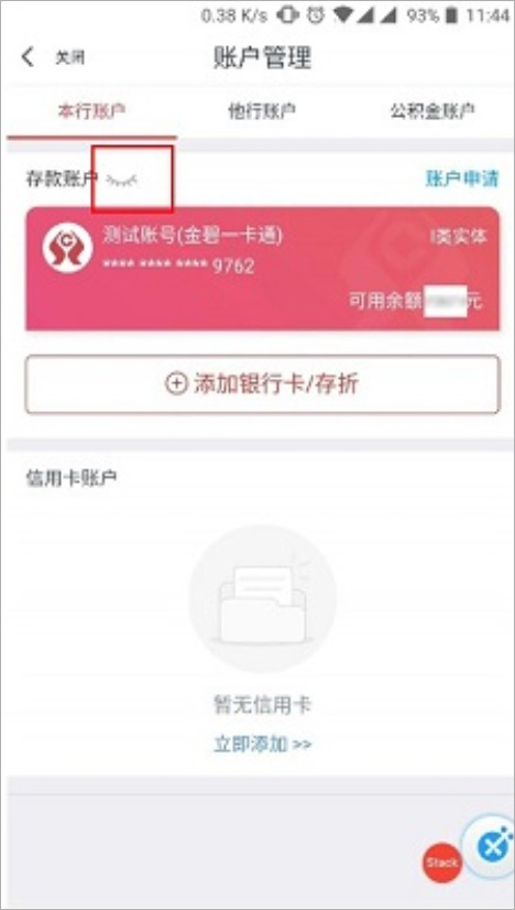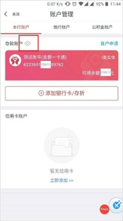 2、在打开账户管理页面中点击如下图红色方框中的小图标,将存款账户信息查看开启