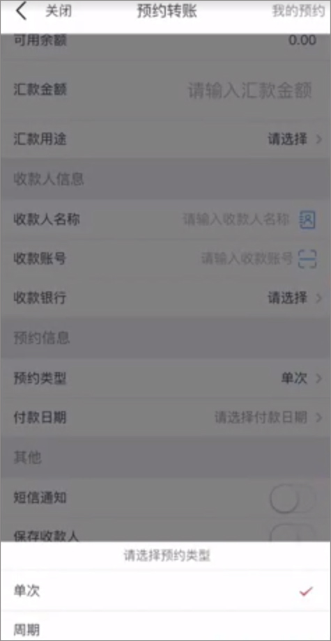 3、其中预约转账可单次或按日、周、月周期性预约转账
