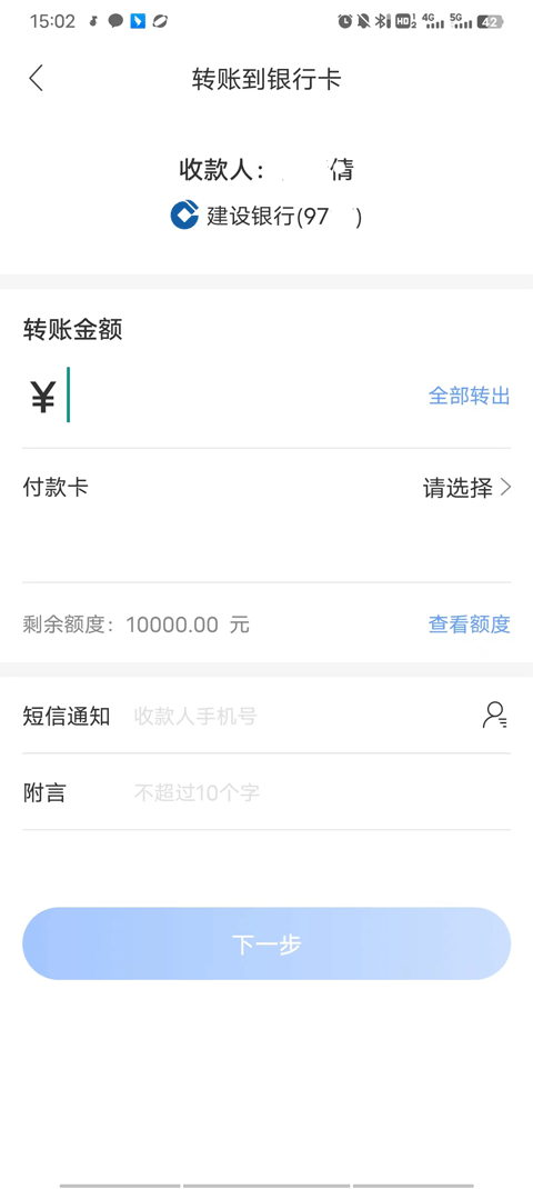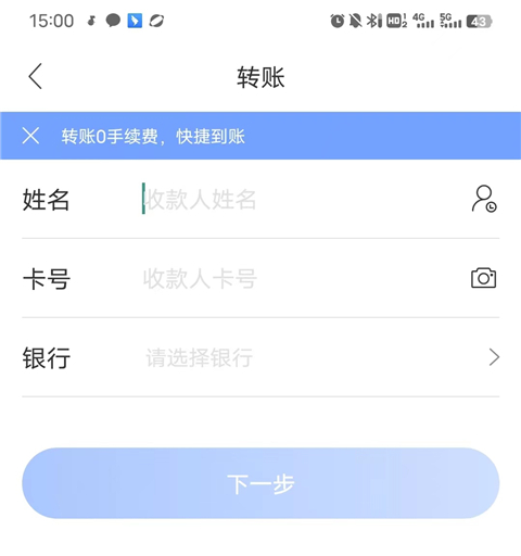 3、输入你想要转入的银行、卡号、姓名;