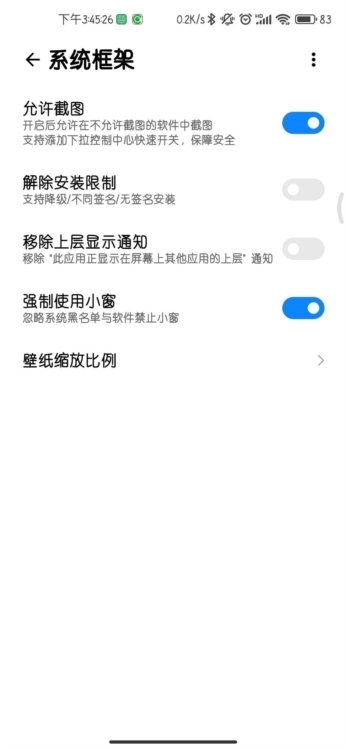 注意:状态栏相关功能需要重启所有作用域才能生效,系统框架内的功能则需重启系统,其余功能调整后可实时生效。