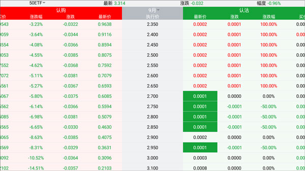 1、实时行情:期权行情T型报价板;
