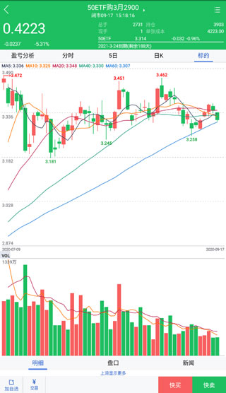 3、认真观察,选中你认为会涨的那只股票,并点击,就可以看到其的盈亏分析、时分、5日走向、日k线、标的,当然在下方也有着加自选、交易、快买、快卖四个功能: