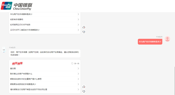 根据官方客服显示,商家用户通过云闪付收银台收款时是由收款机构进行收费的,以下是客服回复页面截图