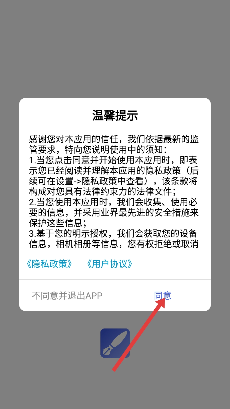 1、首次使用本应用时,需先阅读《隐私政策》和《用户协议》,然后点击【同意】按钮,才能进入应用使用各项功能。