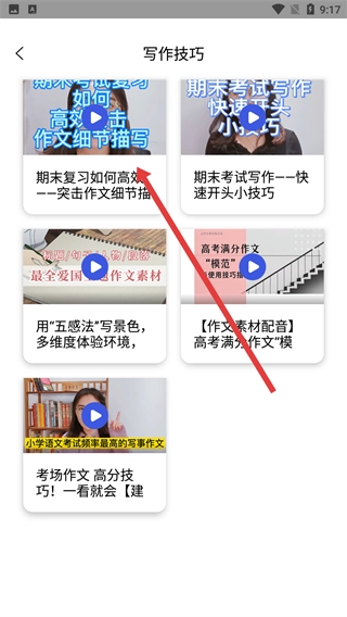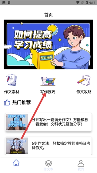 2、进入首页后,找到并点击【写作技巧】选项,即可进入写作技巧板块查看相关内容。