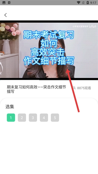 进入视频播放页面后,你可以观看《期末考试复习如何高效突击作文细节描写》视频,也能通过页面下方的选集按钮,选择不同章节进行学习。