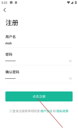 4、在注册页面,依次填写用户名、密码和确认密码,勾选相关协议后点击【点击注册】按钮,即可完成账号创建。