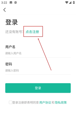 3、在登录页面,若没有账号,可点击【点击注册】按钮,按照提示填写用户名与密码,并勾选相关协议后进行后续操作。