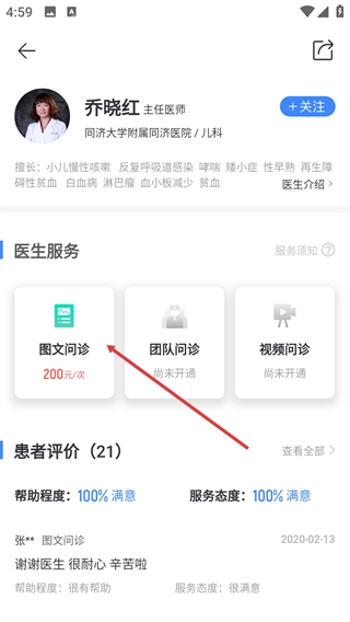 在医生详情页中,找到【医生服务】板块,点击其中的【图文问诊-200元/次】选项,就能发起该问诊服务。