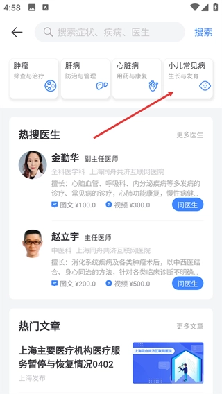 在搜索页面,选择【小儿常见病-生长与发育】分类标签,就能快速找到对应科室的相关内容。