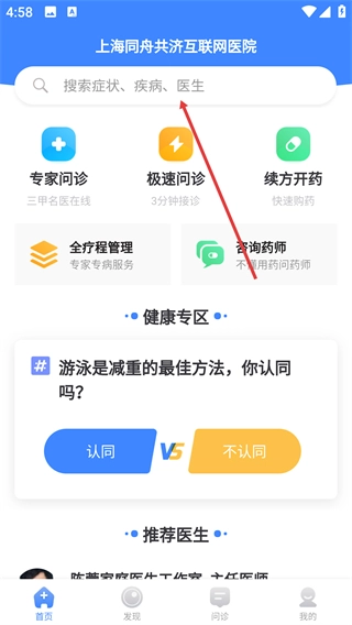 1、进入【上海同舟共济互联网医院】界面后,点击顶部标注着【搜索症状-疾病-医生】的搜索框,即可启用搜索功能。