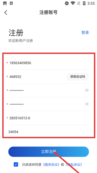 4、进入账号注册页面后,按顺序填写手机号、验证码、密码等所需信息,勾选“已阅读并同意相关协议”选项,最后点击【立即注册】按钮,即可完成账号注册流程。