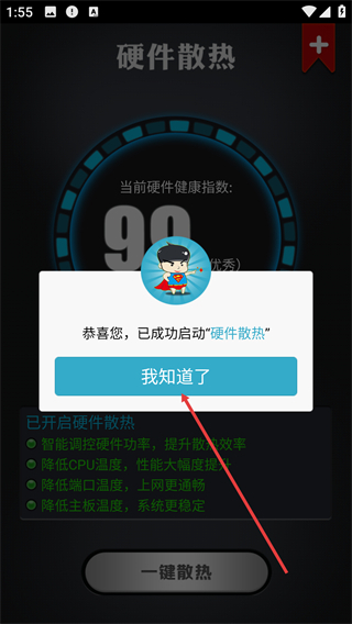 4、散热功能成功启动后,点击提示弹窗里的【我知道了】按钮,就能完成整个散热启动流程。
