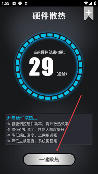 3、进入硬件散热页面后,点击【一键散热】按钮,即可开启智能调节硬件功率的散热功能。