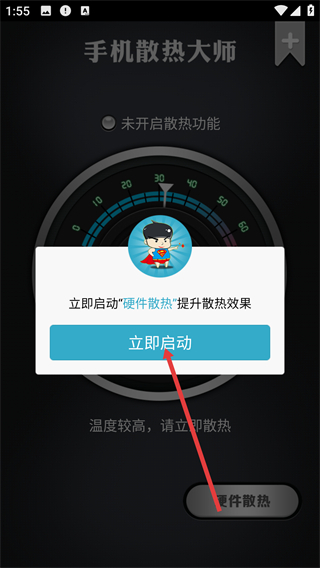 1、打开“手机散热大师”主界面后,点击右上角的功能按钮,系统会弹出硬件散热的启动提示窗口。