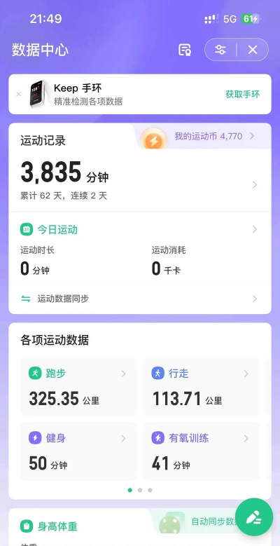 2、仅需通过Keep这一个平台,就能把健身、跑步、骑行、计步等各类运动数据全部记录下来,让你可以全面掌握自己的运动情况。